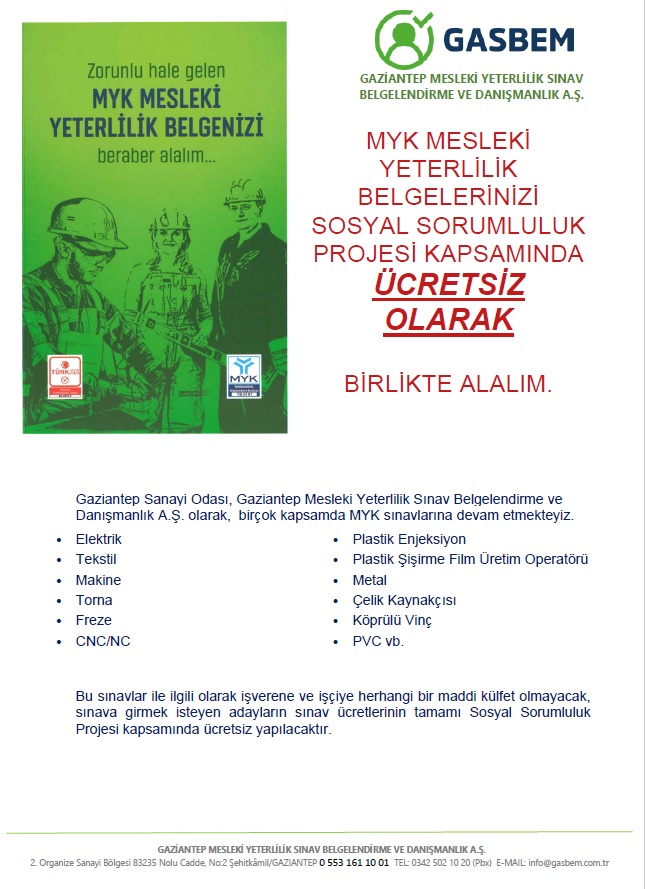 4447 SAYILI KANUNUN GEÇİCİ 10 UNCU MADDESİNDE tanımlanan ve MYK Mesleki Yeterlilik Belgeli kişileri istihdam eden işverenlerin 48 aya kadar işveren prim desteğinden yararlanmasını sağlayan teşvik Bakanlar Kurulunun 2015/8321 sayılı kararı ile 31/12/2020 yılına kadar uzatılmıştır. Kamuoyuna saygıyla duyurulur…