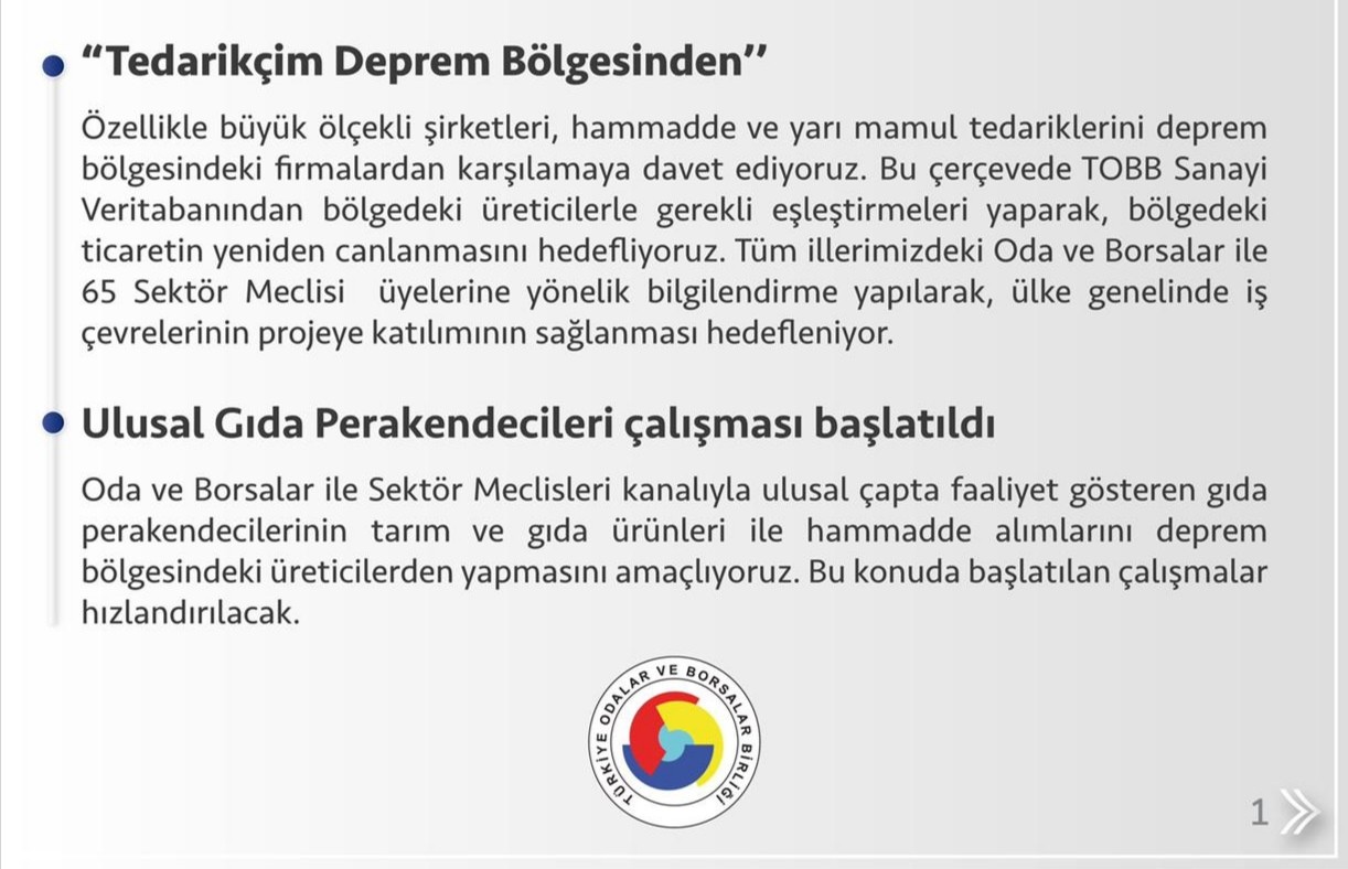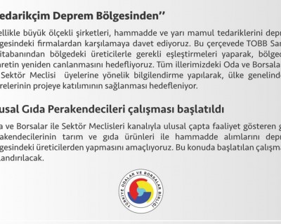 Oda ve Borsalar ile Sektör Meclisleri kanalıyla ulusal çapta faaliyet gösteren gıda perakendecilerinin tarım ve gıda ürünleri ile hammadde alımlarını deprem bölgesindeki üreticilerden yapmasını amaçlıyoruz. Bu konuda başlatılan çalışmalar hızlandırılacak.
