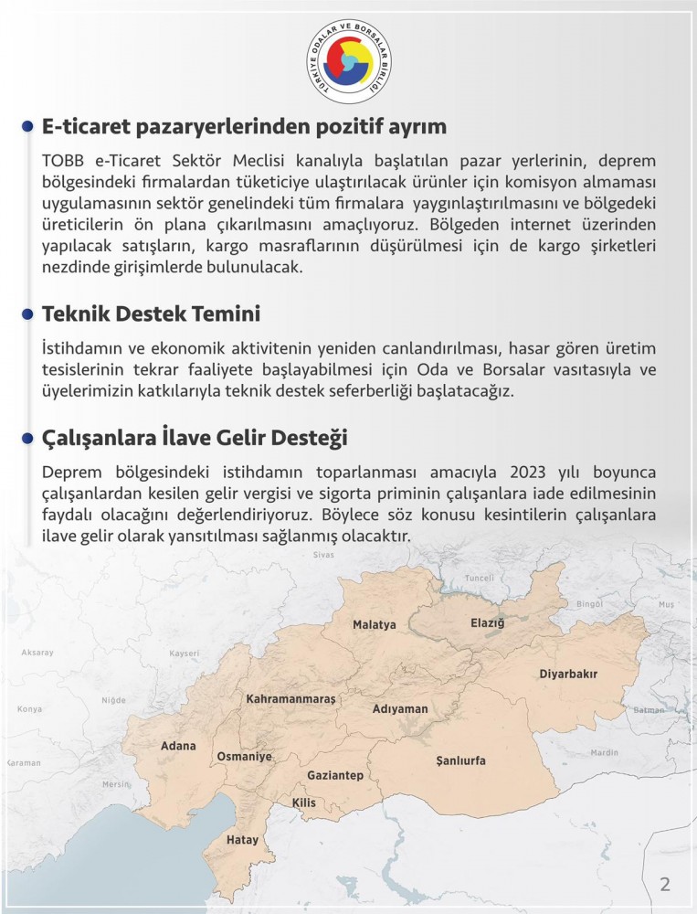 TOBB e-Ticaret Sektör Meclisi kanalıyla başlatılan pazar yerlerinin, deprem bölgesindeki firmalardan tüketiciye ulaştırılacak ürünler için komisyon almaması uygulamasının sektör genelindeki tüm firmalara yaygınlaştırılmasını ve bölgedeki üreticilerin ön plana çıkarılmasını amaçlıyoruz. Bölgeden internet üzerinden yapılacak satışların, kargo masraflarının düşürülmesi için de kargo şirketleri nezdinde girişimlerde bulunulacak.