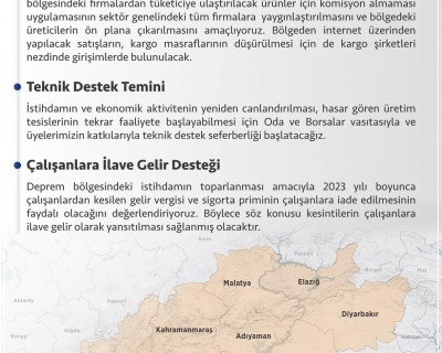 İstihdamın ve ekonomik aktivitenin yeniden canlandırılması, hasar gören üretim tesislerinin tekrar faaliyete başlayabilmesi için Oda ve Borsalar vasıtasıyla ve üyelerimizin katkılarıyla teknik destek seferberliği başlatacağız.